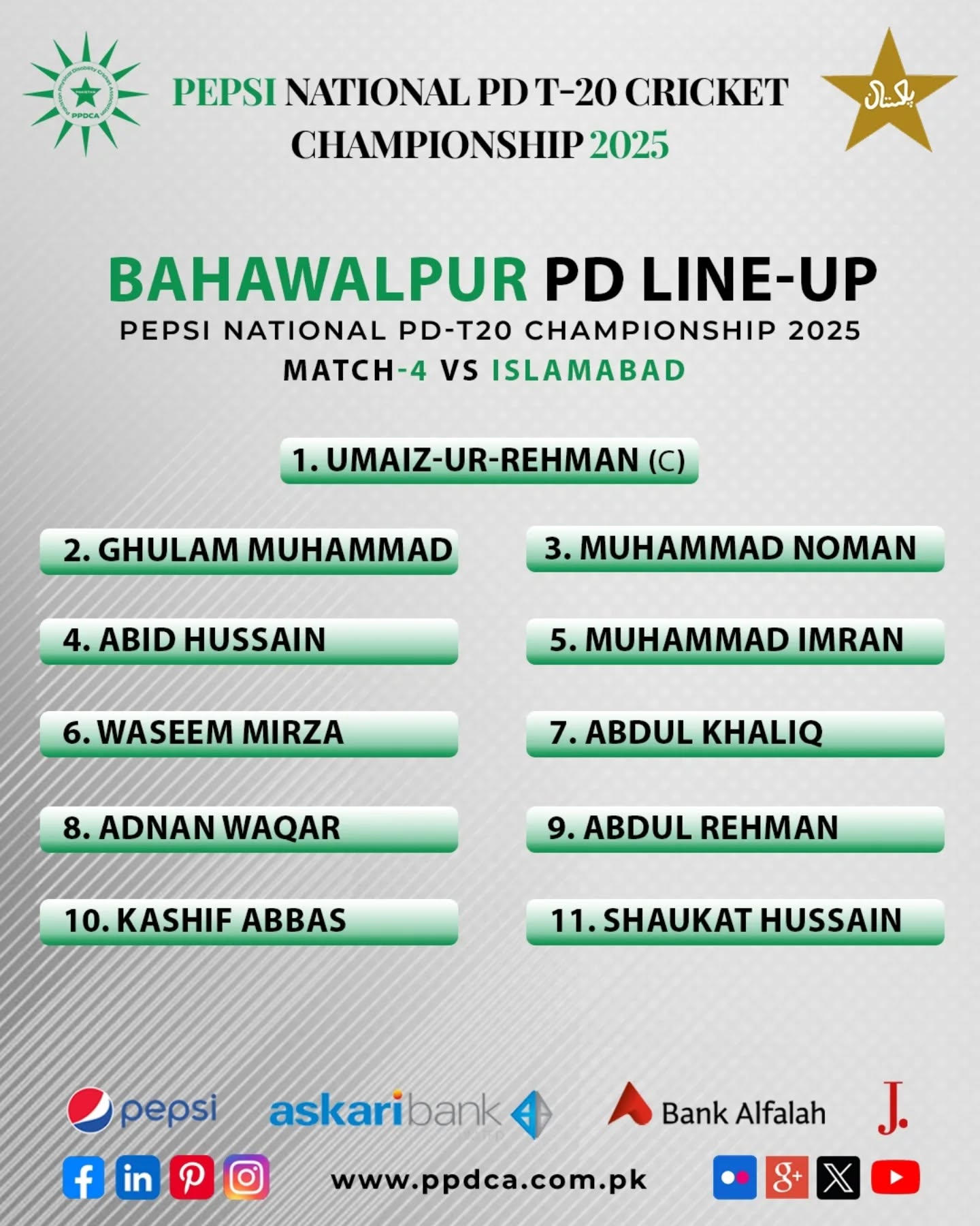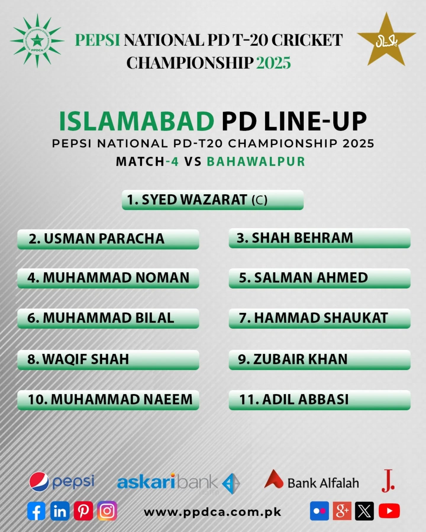 🏏 Toss Update: Bahawalpur vs. Islamabad 🏏 Bahawalpur won the toss and elected to bowl first in the Grade-I Match-4 of Phase-II of the Pepsi National PD T20 Cricket Championship 2025! They’ll be looking to make early breakthroughs against Islamabad in this crucial T20 encounter. Let the games begin! 🔥