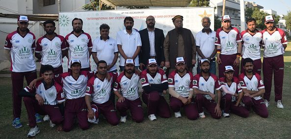 Group photo of Bhawalpur PD team participating in Karachi National Physical Disability T20 Cricket Championship 2022 along with Former Captain Sindh Police Tarab Hussain, Amiruddin Ansari Jameel Kamran and Muhammad Nizam.