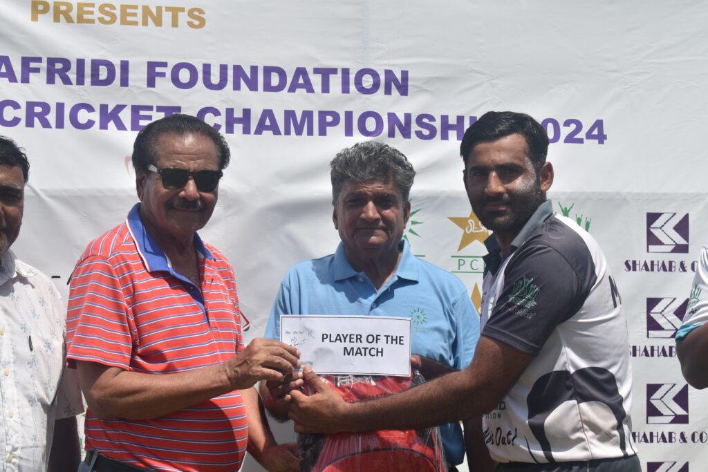 Photo Caption: On the third day of the Shahid Afridi Foundation National Physical Disability T20 Cricket Championship, the chief guest giving the player of the match award to former first-class cricketer Sarwat Ali, Malik Sher, Secretary General Pakistan Physical Disability Cricket Association Amiruddin Ansari. Former first-class cricketer Zia Shamim, Shakeel Sajjad, media manager Muhammad Nizam and others are also present.