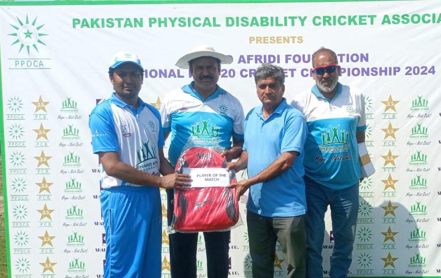 Photo Caption: Mohammad Nizam awarding Player of the Match to Rehmatullah of Peshawar Disability Cricket Team in SAF Disability T20 Cricket Championship, Peshawar captain Nahar Alam, Lahore captain Abdullah and MA Shakir are also present.