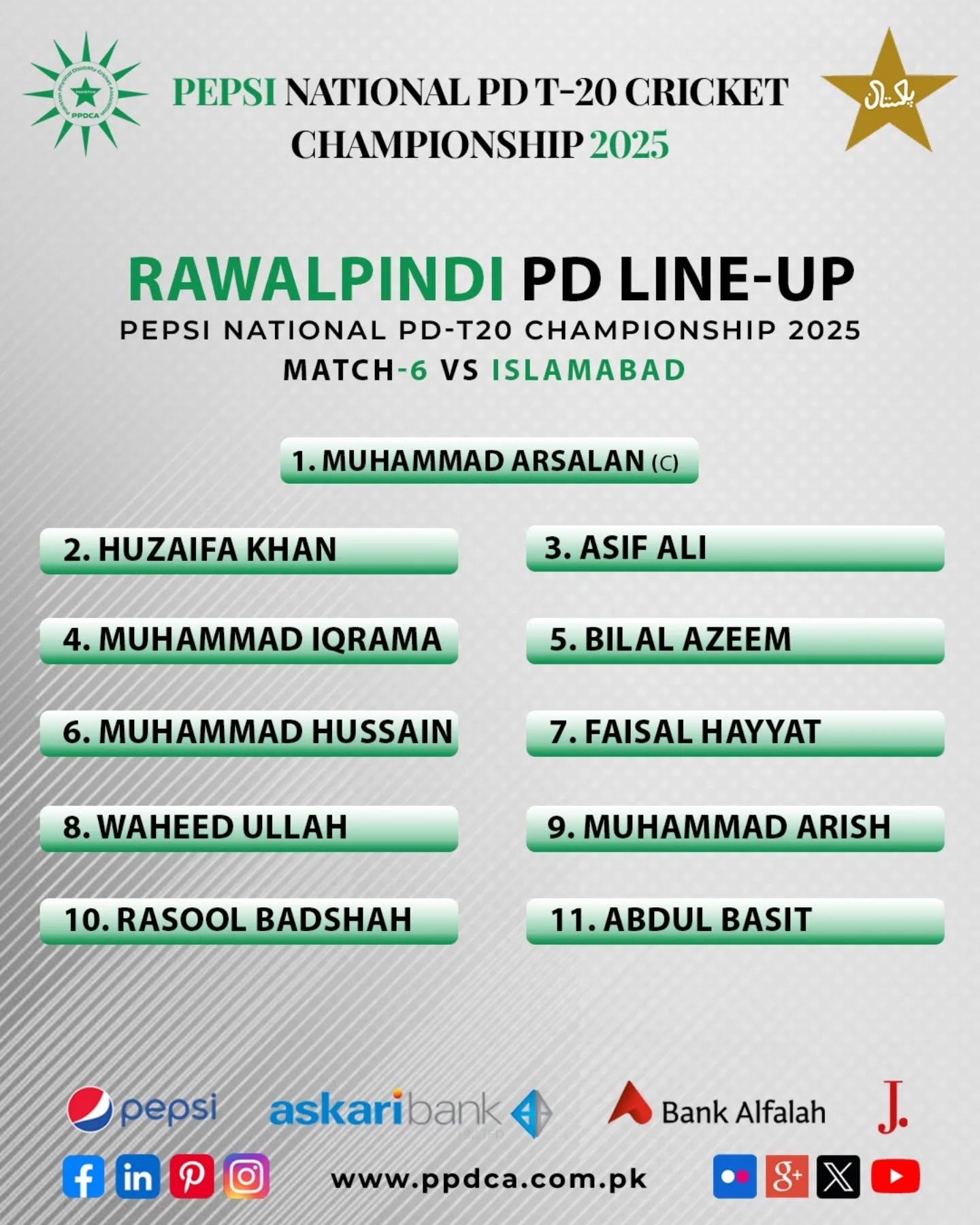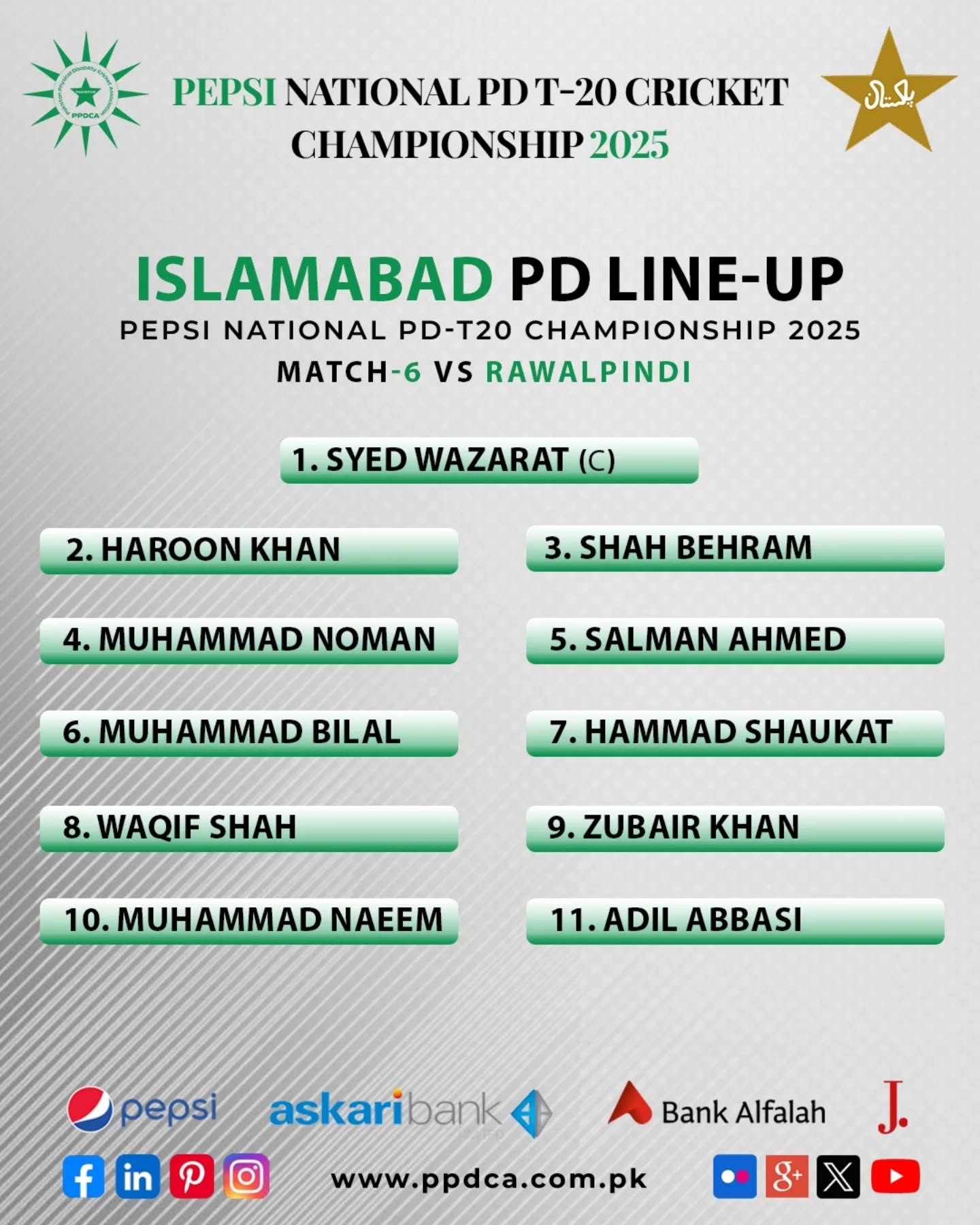 📢 Toss Update! 🏏 In Match-6 of the Grade-I phase-II of the Pepsi National PD T20 Cricket Championship 2025, Islamabad won the toss and elected to bat first against Rawalpindi. We are set for an exciting contest! Best of luck to both teams! 🏆‎‎