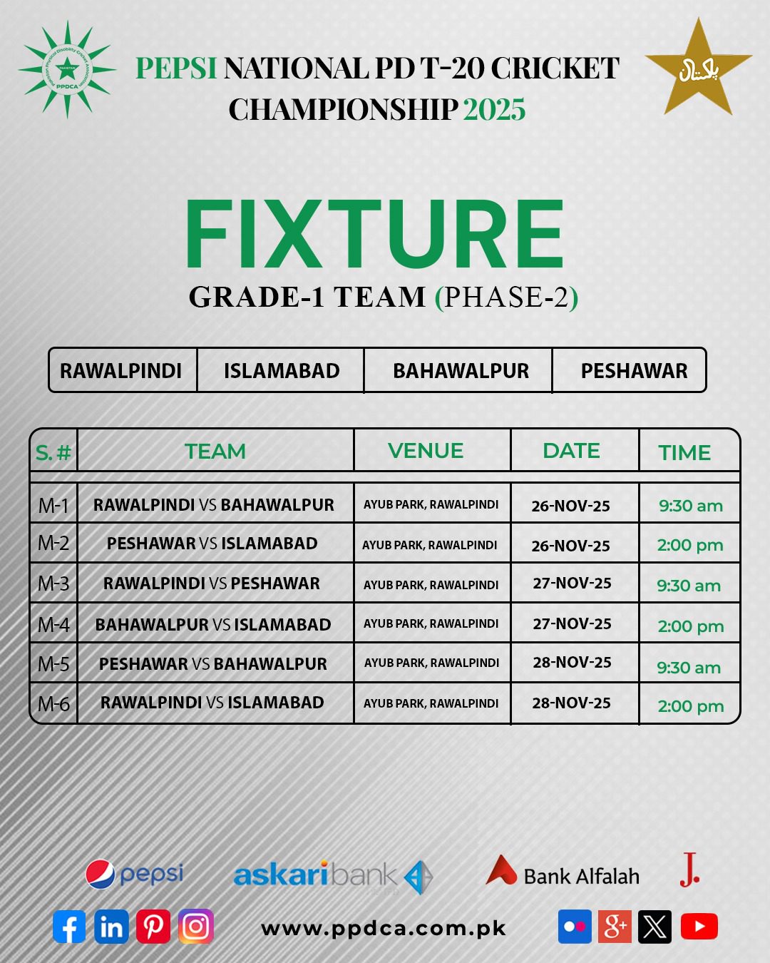 Finally, the wait is over! 🎉 The schedule for Grade-I Phase-II of the Pepsi National PD T20 Cricket Championship 2025 has been officially announced 🏏📢. Get ready for intense matchups ⚔️, thrilling moments 😮‍💨, and nonstop cricket action! 🔥🙌