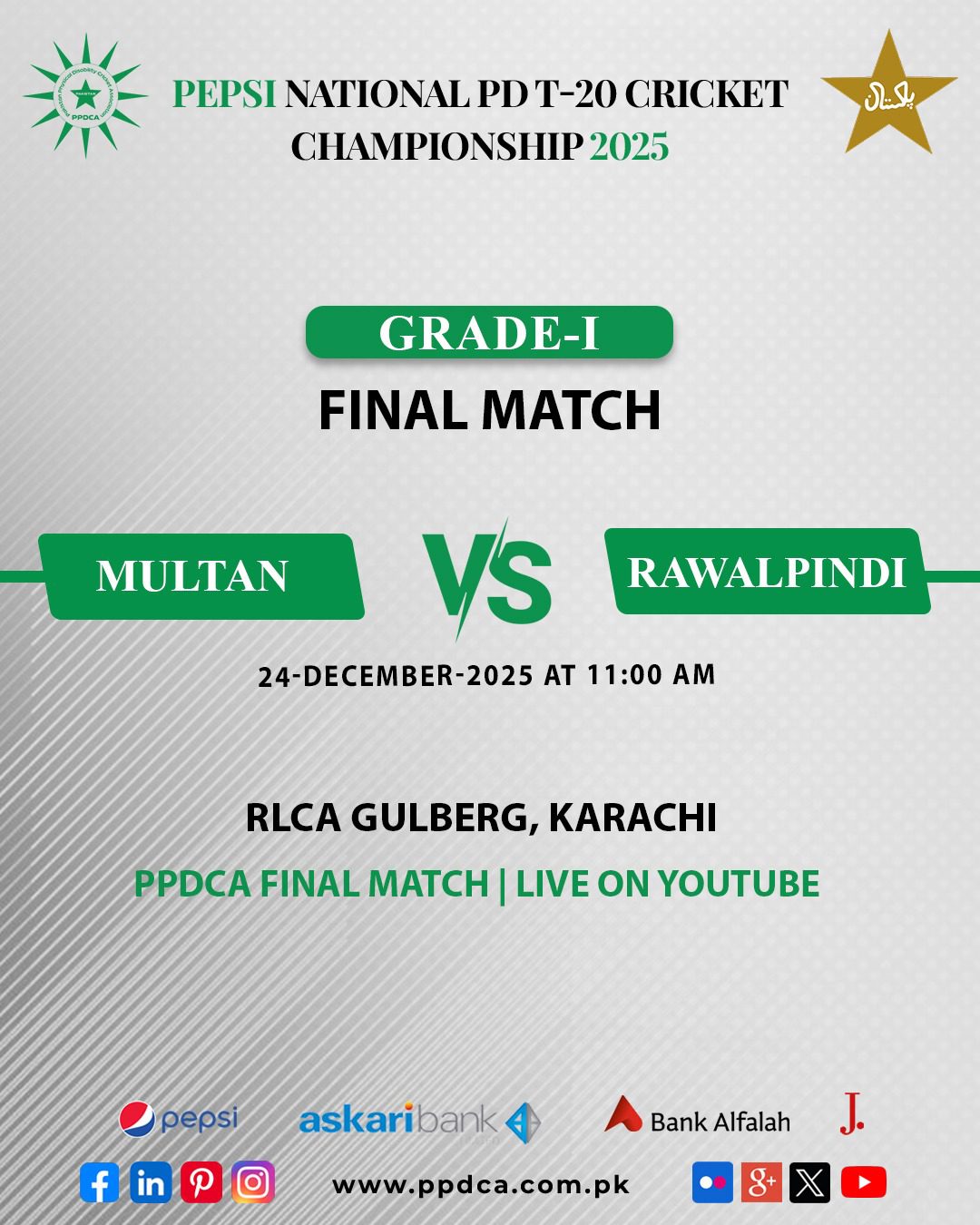 The stage is set for the ultimate showdown! 🏏 The Pepsi National PD T-20 Cricket Championship 2025 has reached its grand finale. Watch Multan take on Rawalpindi in a battle of skill, grit, and pure determination. 💪 Join us at RLCA Gulberg, Karachi, or catch the action live on YouTube! Who are you rooting for? Let’s celebrate the spirit of cricket! 🏆🔥