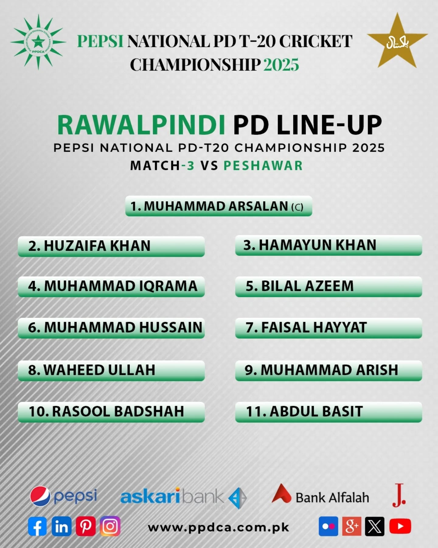 Rawalpindi won the toss and elected to bowl first in the Grade-I Match-3 of Phase-II of the Pepsi National PD T20 Cricket Championship 2025! The team is looking to utilize the conditions by putting Peshawar into bat first in what promises to be an exciting clash! Good luck to both teams!