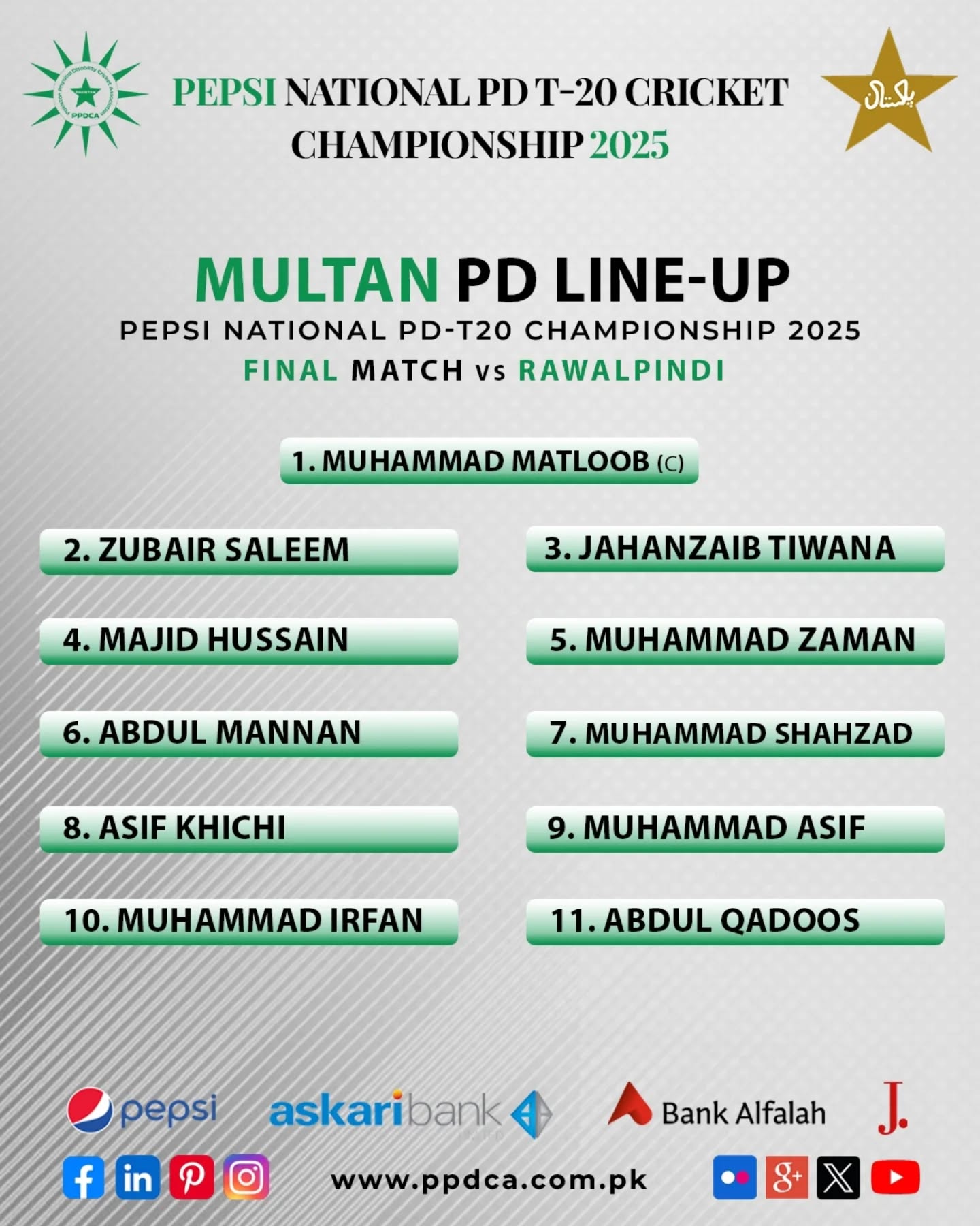 The stage is set for the grand finale of the Pepsi National PD T20 Cricket Championship 2025! In the Grade-I championship clash between Multan and Rawalpindi, Rawalpindi has won the toss and elected to bat first. Expect a high-energy showdown as Multan looks to set a formidable target in this ultimate title decider!