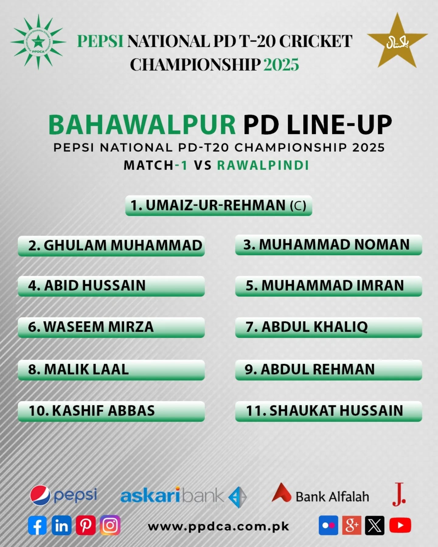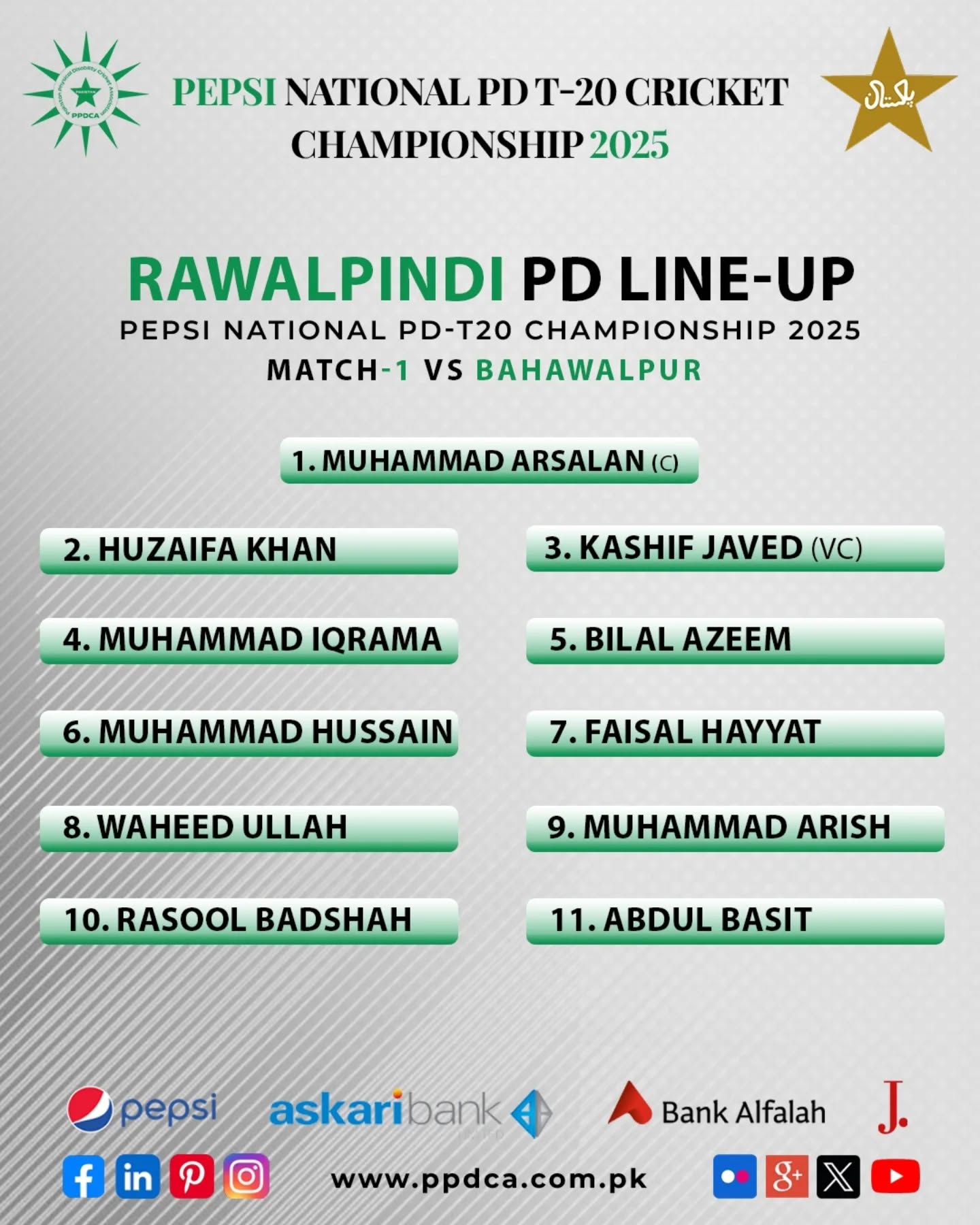 In Match 1, Grade-I of Phase-II of the Pepsi National PD T20 Cricket Championship 2025 between Rawalpindi and Bahawalpur. Get ready for a thrilling chase!